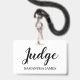 Typographie de script tendance badge de nom de juge pour les compétitions et les concours.