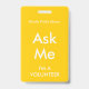 Badges "Demandez-moi" jaune vif pour les bénévoles, les enseignants, les guides, les organisateurs d'événements pour des événements spéciaux, tels que les mariages, les foires artisanales, les salons de la maison et du jardin, les événements caritatifs, les fonctions commerciales et d'entreprise. La couleur de la typographie est ivoire pâle, ce qui donne à ce badge un look moderne. Facile à personnaliser !