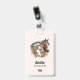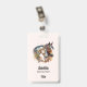 Nom badge avec une image représentant une paire de chevaux. Portant des bandeaux décoratifs. Entouré de plumes et de feuillage.