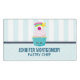 Un badge de nom avec un motif rayé bleu clair et blanc associé à un motif à pois bleu et rose. Sur le dessus se trouve un mignon cupcake bleu avec glaçage rose et un visage kawaii souriant. Une cerise sur le dessus a aussi un joli visage heureux. Une étoile filante vole en l'air