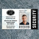 badge de sécurité personnalisable avec un motif arrière - plan géométrique. Personnalisez avec votre photo d'identité, votre numéro d'employé, le titre de l'emploi, le nom de l'entreprise, le logo, la date d'émission, la date d'expiration et un code à barres. Idéal pour divers lieux de travail et professions tels que gardien de sécurité privé, agent de protection rapprochée, sécurité des magasins, garde du corps personnel, portier officiel, commerçant, laissez-passer pour le personnel médical, etc. Couleurs imprimées : bleu, or, noir et blanc. Barrière magnétique de qualité. Magasinez la collection pour plus d'insignes et étiquettes à vendre en ligne, conçu pour l'industrie des services de sécurité.