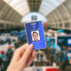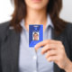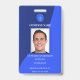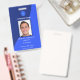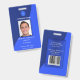 badge d'identification photo design bleu moderne avec espace pour votre photo personnalisée et logo. À l'arrière, vous pouvez ajouter un code à barres personnalisé ou un code QR ainsi que des textes supplémentaires ou supprimer les modèles. Vous pouvez également copier et coller le design et les photos de l'avant vers l'arrière si vous le souhaitez.