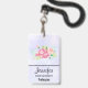 Nom badge avec une belle et élégante aquarelle créé bouquet floral. Fleurs de jardin roses entourées de feuillage vert clair. Arrière - plan d'aquarelle violette.