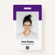 Personnalisez facilement ce badge personnalisé de nom d'employé avec Photo, Scan Qr Bar Code et logo d'entreprise. Un design d'entreprise simple en violet et blanc entièrement personnalisable en tailles avant et arrière, sans-serif polices de base et moderne et un look professionnel et clair. Disponible avec cordon, clip métallique ou avec rétractable. Pas de commande minimum.