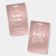 Conception d'équipe de mariée moderne en or rose tendance, personnalisable avec le nom et le titre. Le dos indique "C'est parti les filles", possibilité de conserver ou de supprimer.