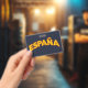 Retro 'España' lettering in red and yellow celebrates Spanish pride. Spain design evokes vintage travel and souvenir style. Bright España typography stands out for fans of Spain.