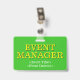 Ce design de badge élégant comporte le message "GÉRANT D'ÉVÉNEMENT". Un badge comme celui-ci pourrait peut-être être utilisé pour identifier que le porteur est un officiel lors d'un événement. [~Z0000307]