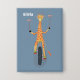Fun blue rectangular button for kids to collect , featuring a giraffe on a unicycle , also balancing spinning plates on two sticks . Personalize it with the child's name if you wish .
