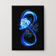Luminous infinity symbol with glowing, beautiful, lushly blooming rose made of blue flames on black background.