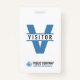 Un badge d'identité de visiteur moderne pour votre entreprise, petite entreprise, école ou hôpital. Le design simple mais élégant montre la lettre majuscule V avec le mot Visiteur. Il comprend le nom commercial et le logo, ainsi qu'une marque commerciale ou un slogan. Ce badge d'identité moderne peut être facilement ajusté pour fonctionner comme un badge d'identité pour les bénévoles.