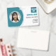 Ce badge d'identification photo médicale horizontale présente un design moderne blanc et bleu clair. Personnalisable avec le nom et le logo de votre hôpital, ainsi que votre photo, nom, position, ID et emplacement. Le dos présente des informations personnalisables utiles en coque de perte.