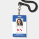 Badge d'infirmière diplômée RN moderne avec photo. Conception avec fond bleu médical et blanc, photo unique, nom de l'hôpital, profession et nom. Personnalisez avec votre code-barres et vos coordonnées. Les badges d'identification modernes permettent aux clients de reconnaître facilement les employés. Pour modifier ce modèle, cliquez sur personnaliser davantage.