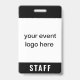 Customisez ce simple badge du personnel de l'événement moderne avec votre logo. Si votre logo est carré, il remplira entièrement l'espace blanc. Si votre logo n'est pas carré, il apparaîtra sur un arrière - plan noir. Le dos de l'insigne peut être personnalisé avec le nom de l'événement et la date ou l'année, ou vous pouvez supprimer les deux pour avoir un dos tout noir. Ce badge personnel minimaliste est idéal pour les employés lors d'événements spéciaux, de festivals, de concerts et de conventions.