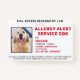 Allergy Alert Service Chien - Identifiez facilement votre chien comme chien de service actif, tout en gardant votre chien concentré et en réduisant les distractions tout en travaillant avec l'un de ces badges d'identification de chien de service k9. Bien qu'il ne soit pas obligatoire, un badge d'identification de chien aidant vous donne la tranquillité d'esprit et la facilité de voyage sans tracas et questions lorsque vous cherchez un accès public. DROIT D'AUTEUR © 2020 Judy Burrows, Black Dog Art - Tous droits réservés. Insigne d'identité photo du chien du Service d'alerte aux allergies
