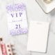Un badge moderne, élégant et glamour pour une fête d'anniversaire de 21 ans (ou tout âge). Un fond blanc avec de la poussière de glitter fausse violette et lavande. Avec le texte : VIP. Personnalisez et ajoutez le nom, l'âge, l'adresse/date. Le nom est écrit avec un style de lettrage à la main moderne avec des fioritures.