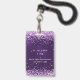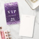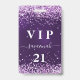 Un badge moderne, élégant et glamour pour une fête d'anniversaire du 21e (ou tout âge). Un fond violet foncé avec des confettis violets et roses. La couleur de fond violet est inégale. Personnalisez et ajoutez un nom. Le nom est écrit avec un style de lettrage manuscrit moderne avec des fioritures. Le texte : VIP Numéro 21. Pour conserver les fioritures, supprimez simplement le nom de l'exemple, laissez les espaces ou les émojis devant et après le nom.