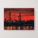 Dans cette aquarelle industrielle, le ciel est inondé de rouge après un coucher de soleil brillant à Portland, dans le Maine. Les derricks d'huile en construction créent des silhouettes dures contre les brillants rouges et oranges. Des pointes de lumière, réfléchissant dans l'eau de l'océan pendant que les travaux se poursuivent dans la nuit.