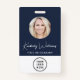 badge professionnel moderne d'identité bleue avec photo de votre employé dans un cadre circulaire, son nom dans un script blanc chic et son titre en lettres blanches simples, et son logo d'entreprise. Au verso, ajoutez des informations supplémentaires et des codes QR et barres optionnels.