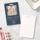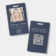 badge d'identification bleu professionnel avec photo de votre employé, son nom dans un script blanc chic et son titre en lettres blanches simples, et le logo de votre entreprise ou de votre organisation. Au verso, ajoutez des informations supplémentaires et du code QR facultatif.