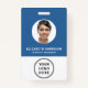 Un badge d'identification d'employé professionnel bleu portant sa photo dans un cadre circulaire, son nom et son titre en lettres simples, et le logo de votre entreprise ou organisation. Au verso, ajoutez des informations supplémentaires et du code QR facultatif.