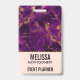 Insigne de nom avec un beau motif abstrait au design marbré. Des couleurs violettes riches se mélangent avec des rubans tourbillonnants d'or faux, mélangeant et mélangeant les couleurs tout au long du design. Une couche de couleur pêche sous le motif avec une bande d'or-feuille élégante entre eux.