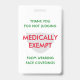 Élégant blanc MEDICALLY EXEMPT Badge, montrant MEDICALLY EXEMPT en texte rouge sur un masque de visage gris pâle. Le texte rouge et vert indique le MERCI POUR NE PAS JUGER, EXONÉRÉ MÉDICALEMENT DE PORTER DES COUVERTURES DE VISAGE. Ce texte est PERSONNALISABLE afin que vous puissiez le remplacer par votre motif d'exemption (par exemple autisme, asthme, incapacité cachée, etc.) ou vous pouvez ajouter votre nom, si vous le souhaitez. L'arrière - plan est BLANC. Cela donne une grande réponse à tous les regards de jugement et est une bonne façon de montrer que la distance sociale est nécessaire.