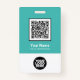 Personnalisez facilement ce badge personnalisé de nom d'employé avec ou sans photo, code Qr, code de barre d'analyse et logo d'entreprise. Un design d'entreprise simple dans les tons bleu clair turquoise et blanc entièrement personnalisable en tailles avant et arrière, sans-serif polices basiques et modernes et un look professionnel et clair. Disponible avec cordon, clip métallique ou avec rétractable. Pas de commande minimum.
