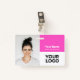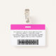 Personnalisez facilement ce badge personnalisé de nom d'employé avec photo, code à barres d'analyse et logo de l'entreprise, avec nom de personne, profession, code à barres d'identité optionnel, avec clip métallique inclus. Un badge de marque utile pour identifier le personnel, les visiteurs ou les invités. Un design d'entreprise simple avec une grande photo en mignonette féminine néon fuchsia rose et blanc entièrement personnalisable en tailles avant et arrière, dans n'importe quelle couleur arrière - plan, sans-serif polices de base et moderne et un look professionnel et clair. Un outil utile pour les événements d'entreprise, les réunions, les nouvelles et les célébrations. Créez plus de carte d'identification de badge photo d'entreprise en différentes couleurs pour toute catégorie que vous devez identifier : personnel, visiteurs ou invités. Disponible avec ou sans nacelle, clip métallique ou avec rétractable. Pas de commande minimum.