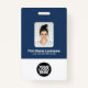 Personnalisez facilement ce badge personnalisé de nom d'employé avec Photo, Scan Qr Code (toujours lisible, ça marche !) et logo d'entreprise. Un design d'entreprise simple en bleu marine et blanc entièrement personnalisable en tailles avant et arrière, sans-serif polices de base et moderne et un look professionnel et clair. Disponible avec cordon, clip métallique ou avec rétractable. Pas de commande minimum.