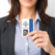 Ce badge d'identification d'un agent de sécurité ou d'un employé comporte un arrière - plan blanc avec un exemple de logo au centre. Vous pouvez personnaliser le badge d'identification pour afficher votre propre logo d'entreprise, d'entreprise ou d'organisation, ou votre propre image personnalisée. Il y a une zone sous le logo pour imprimer un nom d'employé ou un autre texte. Le mot "SÉCURITÉ" est imprimé à droite sur une bannière bleue. Un exemple de photo est imprimé dans la partie inférieure que vous pouvez remplacer pour créer votre propre pièce d'identité. Le dos du badge a un arrière - plan bleu avec un texte blanc où vous pouvez inclure votre numéro de téléphone de compagnie ou d'autres informations.
