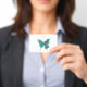 Papillon vert fictif, dessiné artistiquement, avec des plumes de paon vertes et belles sur fond blanc.