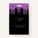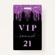 Un badge moderne, élégant et glamour pour une fête d'anniversaire de 21e (ou tout âge). Un arrière - plan noir à la fausse parties scintillant violette goutte-à-goutte, la peinture goutte à goutte. Personnalisez et ajoutez un nom et 21 ans. Le nom est écrit avec un script de style moderne écrit à la main avec des swashes. Le texte : VIP og Number 21 est écrit en rose clair. Pour que les swashes ne suppriment que le nom de l'échantillon, laissez les espaces ou émoticônes devant et après le nom. Retour : détails de votre fête.