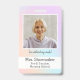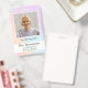 Un badge photo d'identité d'enseignant(e) de maternelle arc-en-ciel pastel joli pour usage en classe, afin que les élèves puissent voir leur enseignant(e) de maternelle souriant sans masque. Modèles de texte personnalisés pour le nom de l'enseignant, l'école, comprend également un modèle de photo personnalisé pour que vous puissiez facilement ajouter votre propre photo. Le verso comporte un espace pour une adresse, un numéro de téléphone et une adresse e-mail. Fond holographique licorne arc-en-ciel joli.