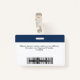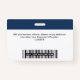 Personnalisez facilement ce badge personnalisé de nom d'employé avec photo, code de la barre d'analyse et logo de l'entreprise, avec cordon inclus. Un design d'entreprise simple en bleu marine et blanc entièrement personnalisable en tailles avant et arrière, sans-serif polices de base et moderne et un look professionnel et clair. Disponible avec ou sans nacelle, clip métallique ou avec rétractable. Pas de commande minimum.