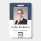 Personnalisez facilement ce nom d'employé bleu personnalisé et badge photo avec votre propre logo d'entreprise et code qr ou code à barres. Disponible avec différentes couleurs et pièces jointes arrière - plans. Pas de quantité minimale de commande.