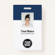 Personnalisez facilement ce simple badge personnalisé de nom d'employé avec Photo, Scan Qr Code (toujours lisible, il fonctionne!) et logo de l'entreprise. Un design d'entreprise simple en bleu marine et blanc entièrement personnalisable en tailles avant et arrière, sans-serif polices de base et moderne et un look professionnel et clair. Disponible avec cordon, clip métallique ou avec rétractable. Pas de commande minimum.