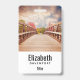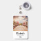 badge de nom personnalisé avec une photo pittoresque. Un pont en bois qui mène à un chemin entouré d'arbres forestiers qui changent de couleur.