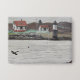 A painting of Ram Island near Boothbay Harbor in Maine. The artwork depicts Ram Island Lighthouse and it's support buildings as seen from Ocean Point, Maine looking across Fisherman Island Passage. The island can be seen through a light layer of fog while a duck lifts off from the water in the foreground. The lighthouse was built in 1883 and is still an operational US Coast Guard navigation aid. This Ram Island Light is not to be confused with Ram Island Ledge Lighthouse which sits at the entrance to Casco Bay near Portland, Maine further to the south.