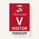 badge de visiteur vertical avec un design simple en blanc contre un arrière - plan rouge mat. Un grand V blanc permet de reconnaître rapidement le visiteur en tant que tel. Personnalisez avec votre logo d'entreprise et un code à barres.