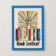 Manifestation contre l'interdiction des livres avec cette image qui présente une étagère de livres interdits, une poing levée de protestation, une explosion de rayons de couleurs et les mots "justice du livre" dans une police rétro. Accentué par une bordure de bleu riche. Ça a l'air super !