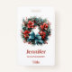 Nom badge avec une jolie couronne de Noël. Une image festive avec une couronne de pin décorée de fleurs rouges, sainte et un joli arc bleu. Délicieux.