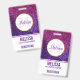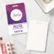 Badge avec un design élégant et fantaisiste. Le fond est composé de strass à paillettes rose et violet. Ambiance tendance et féminine. Un cercle avec une bordure en faux-plaqué or superposé avec votre nom et initiale à l'intérieur.