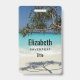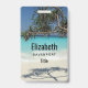 badge de nom personnalisé avec une belle photo ensoleillée. Eaux turquoise tropicales bleues de l'océan, avec une plage de sable blanc. Un arbre tropical en solo offre un endroit agréable pour se détendre et profiter de cet endroit idyllique pittoresque.