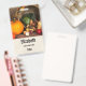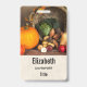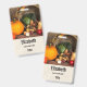 badge de nom personnalisé avec photo d'une récolte d'action de grâce, posé sur une table en bois rustique. Citrouille, pommes de terre, courge etc... composent cette belle collection de nourriture. Des feuilles d'automne colorées entourent le panier de la cornucopie.