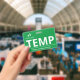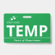 Badge à température verticale avec un design simple en blanc contre un arrière - plan vert. De grandes lettres propres permettent de reconnaître rapidement la température en tant que telle. Personnalisez avec le logo de votre entreprise.