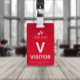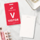 Badge de visiteur vertical avec un design simple en blanc sur fond rouge. Un grand V blanc permet de reconnaître facilement le visiteur en tant que tel. Personnalisez avec votre logo d'entreprise.