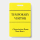 Ce design de badge élégant comporte le message "VISITEUR TEMPORAIRE" et un nom de société personnalisable ou un autre message personnalisé. Un badge comme celui-ci pourrait être utilisé pour indiquer qu'un visiteur ou un invité sur un lieu de travail est autorisé à y être. [~Z0000307]