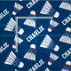 Badminton racquet sport repeat personalized shuttlecock pattern sporting design fabric. White shuttles with a blue or red band on a blue background colour which can be changed if required. Ideal for badminton fans. Customize with your own choice of name, currently reads Charlie. Art and designed by Sarah Trett.