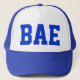 Royal Blue and White Trucker Hat with printed BAE in blue lettering.