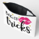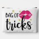 A bold design featuring bright pink lips with a playful tongue, surrounded by golden sparkling stars, paired with the text “Bag of Tricks.”